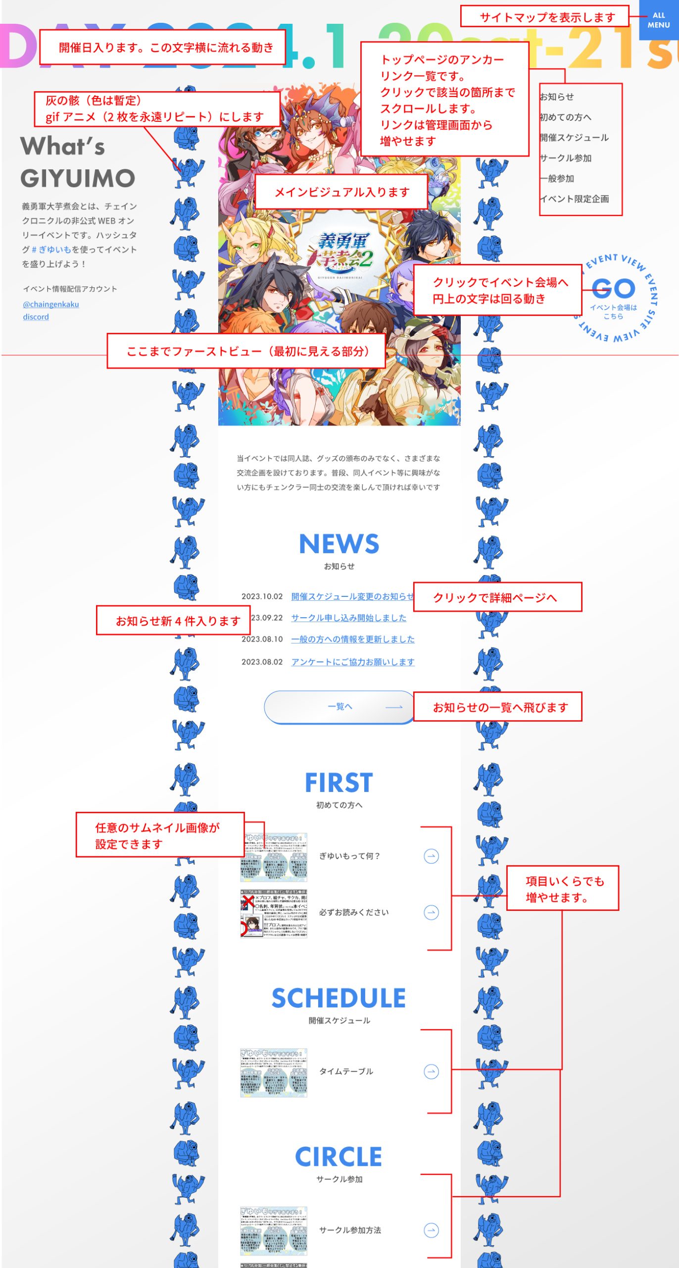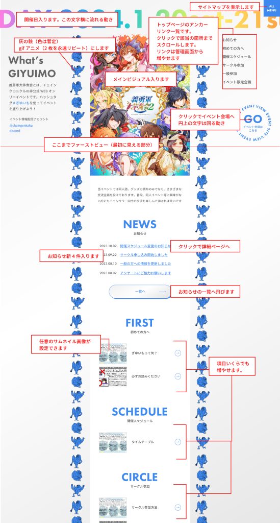 イベントなのでシンプルになりすぎないように…とは思いましたが、 灰の骸くんを入れると思ったより賑やかになったので、 他の部分はスッキリとさせて内容の見やすさを優先しました。 実際のブラウザ上ではそこかしこに動きを取り入れて ドンチャン感(?)を出そうと思っています。