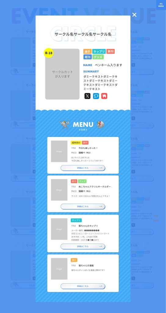 お品書きボタンクリックで、サークル情報をポップアップ表示